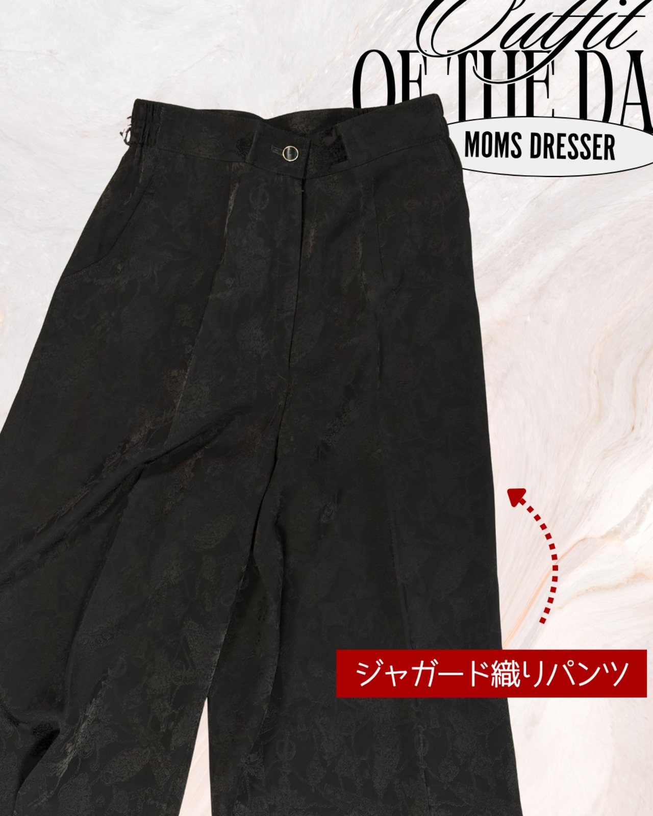 特徴的なジャガード織りで仕上げたこのパンツは、高級感あふれる仕立てが魅力です。太めのシルエットなので、ゆったりとした快適な着心地を実現しつつ、スタイリッシュに見せてくれます。ポケット付きで実用性も備えているため、普段使いからお出かけまで幅広く活躍します。シワがつかない素材で、いつでもキレイな状態を保てるのも嬉しいポイントです!