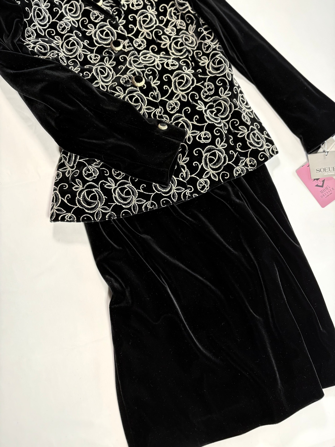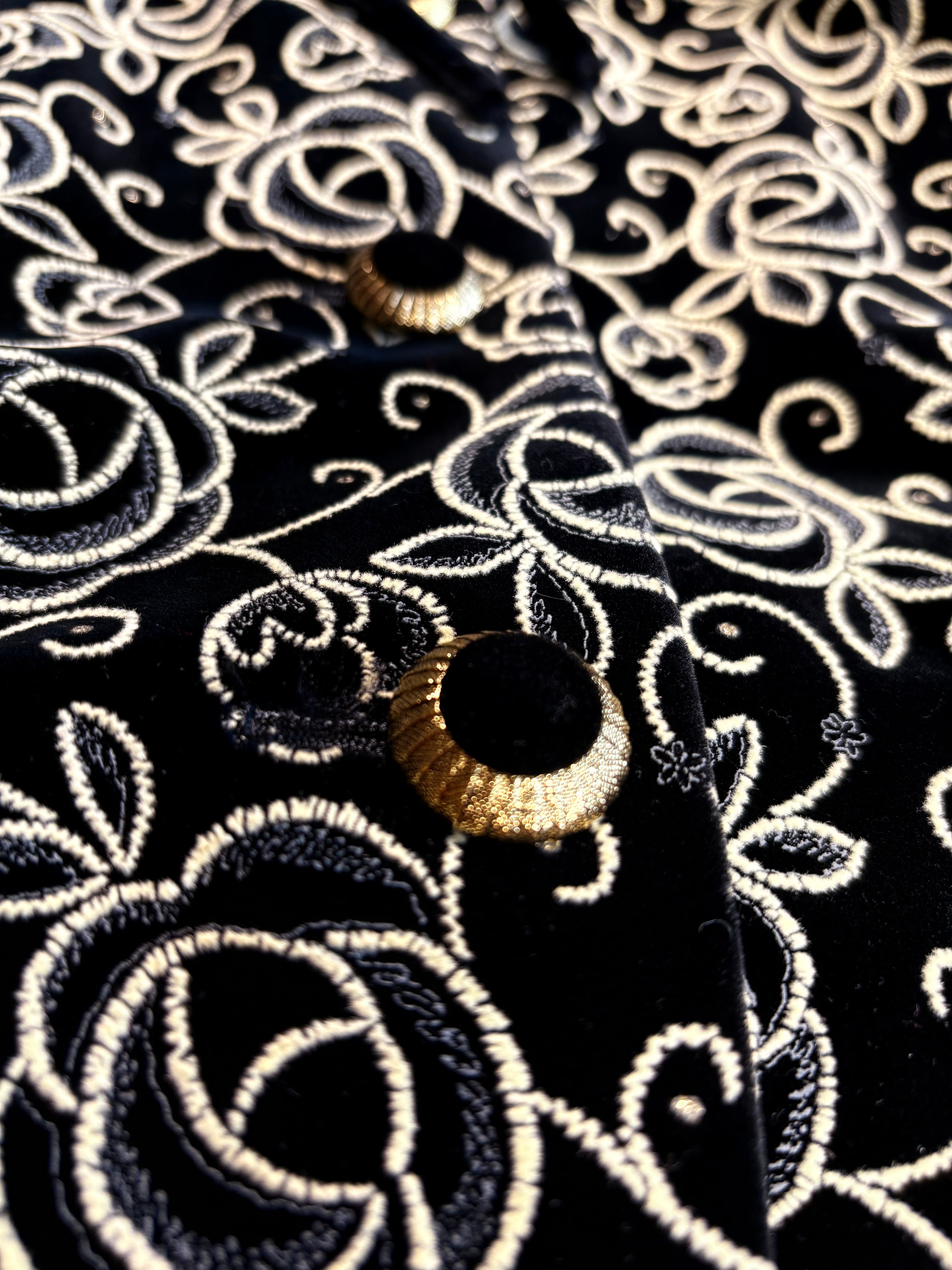 美しいベロア素材を使用したこのセットアップは、クラシカルなデザインが特長です。施された豪華な刺繍が、シンプルながらも存在感を放ち、特別なシーンにもぴったりです。さらに、ベロア素材ボタンが優雅さを引き立て、着心地を考慮した仕立てになっています。