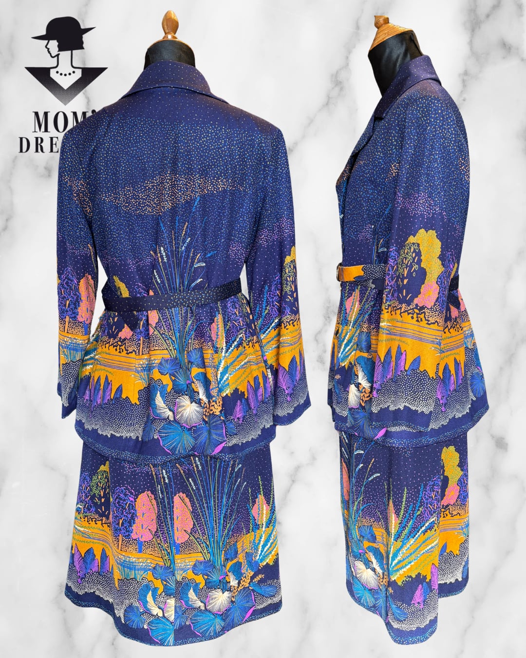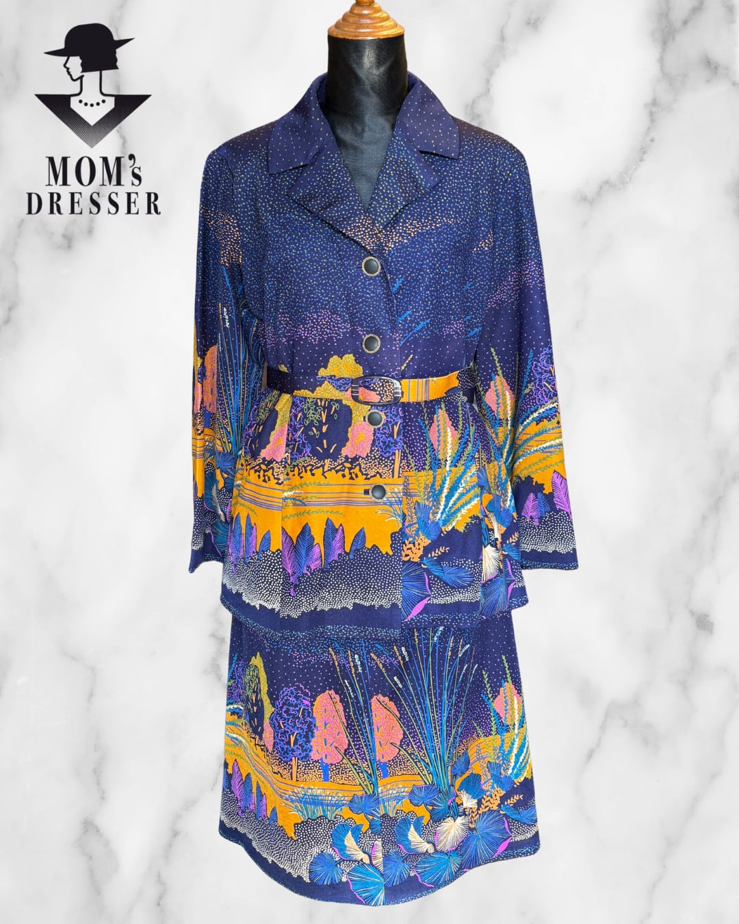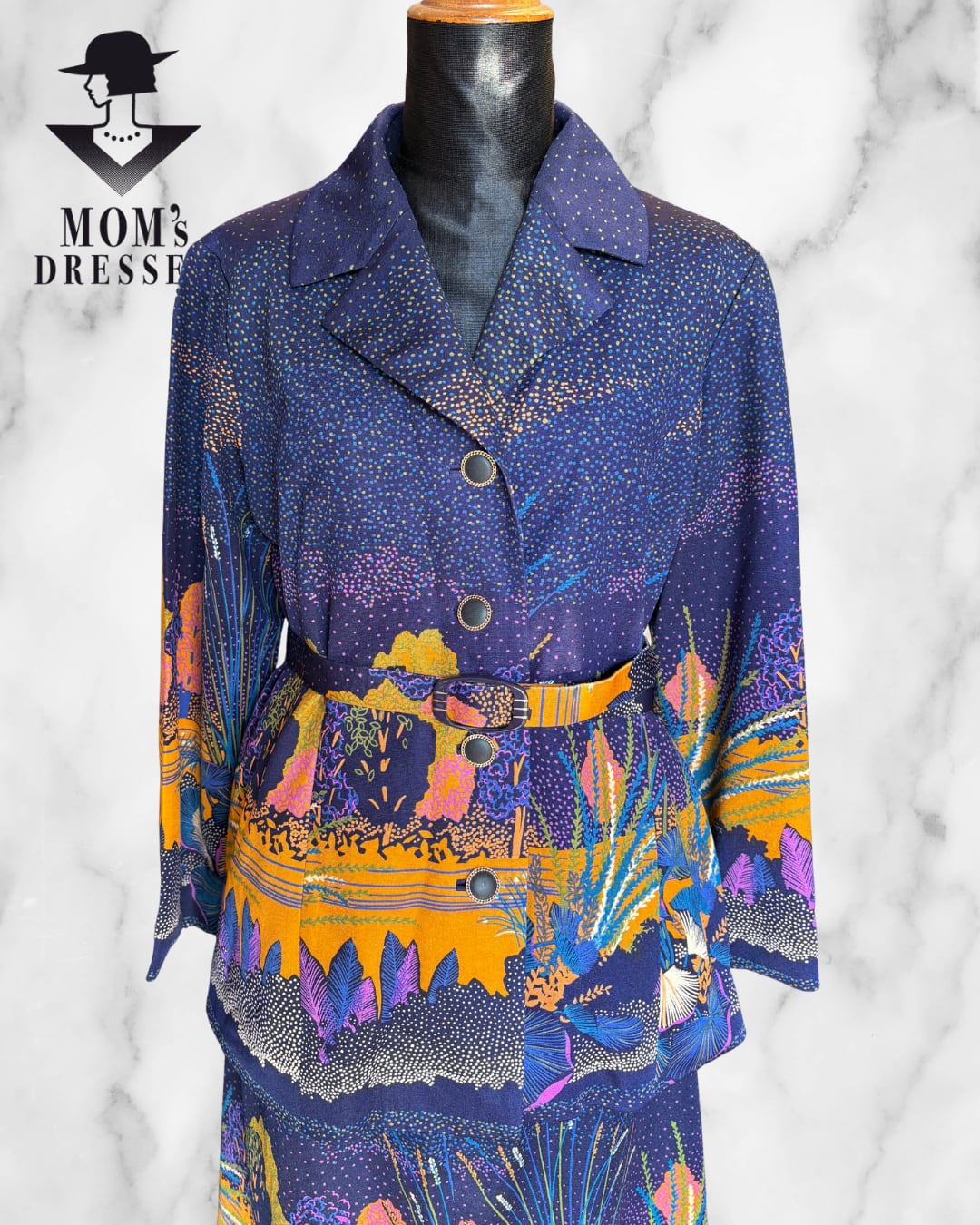 ゴールド縁の可愛いボタンが施されたこの70年代レトロセットアップは、ファッションに華やかさを添えるアイテムです。