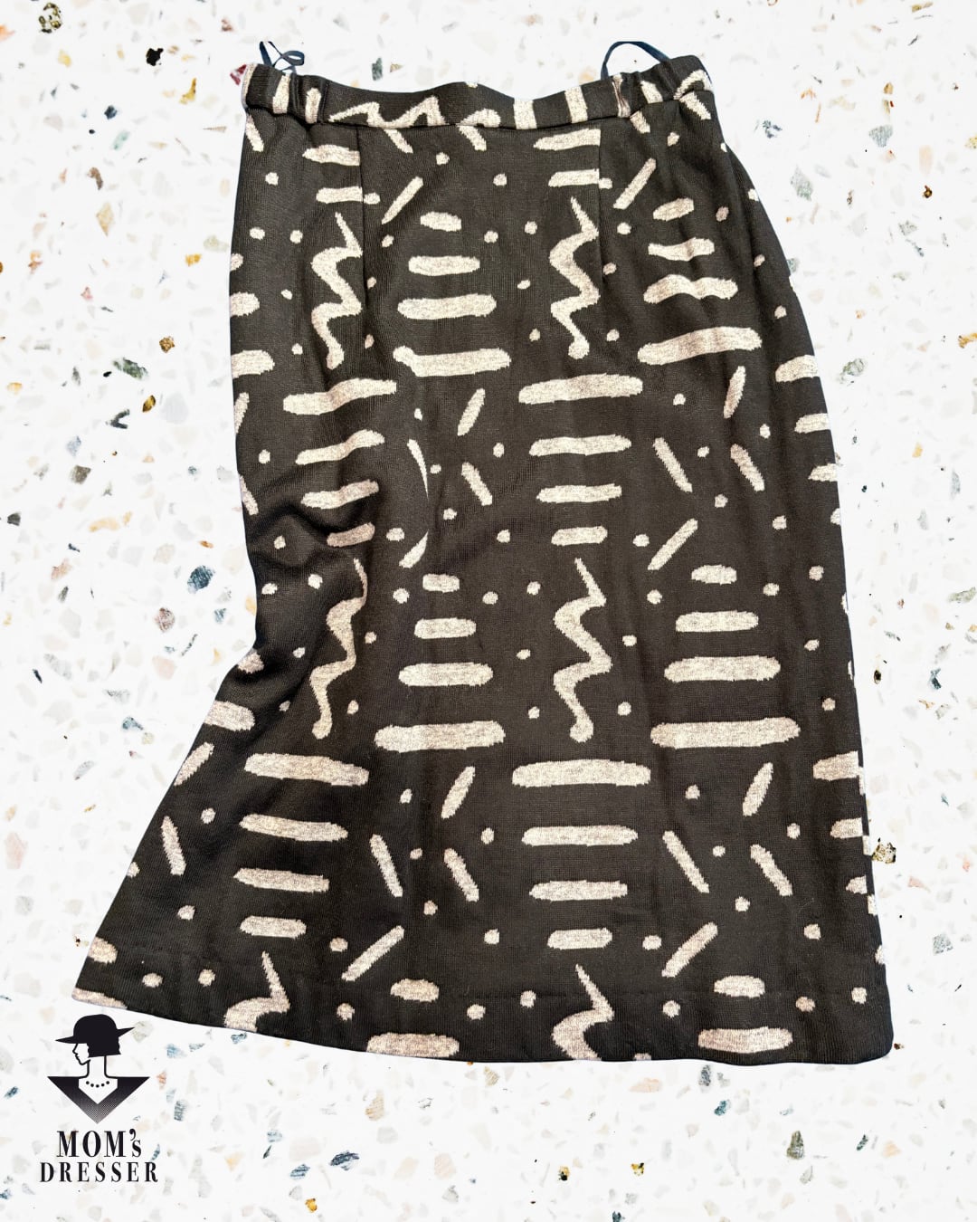 このスウェットスカートは、膝下までの丈感と個性的な幾何学デザインが魅力です。モノクロの配色が特徴で、どんなスタイルにも合わせやすく、スポーティーなコーディネートにもぴったりです。