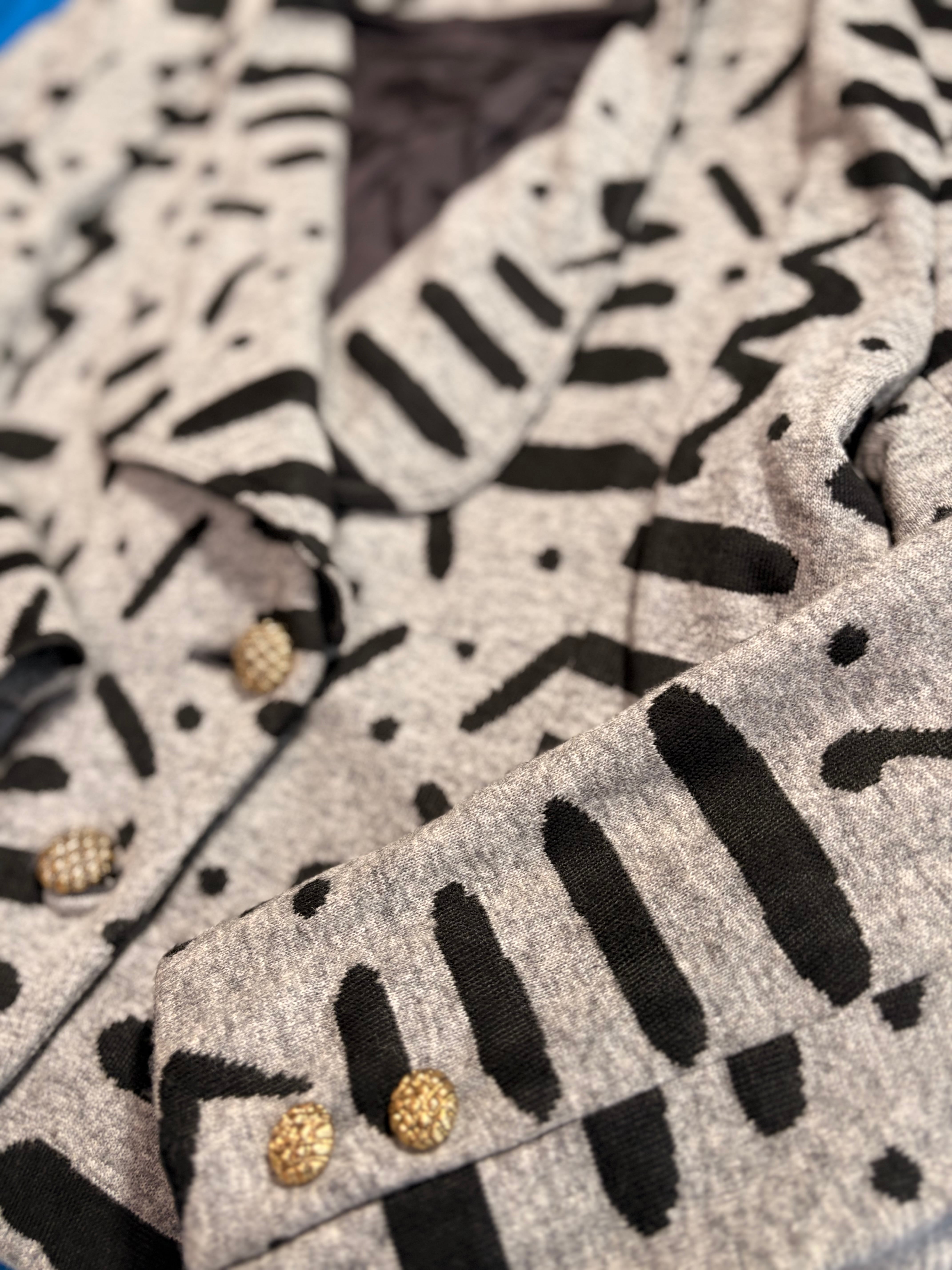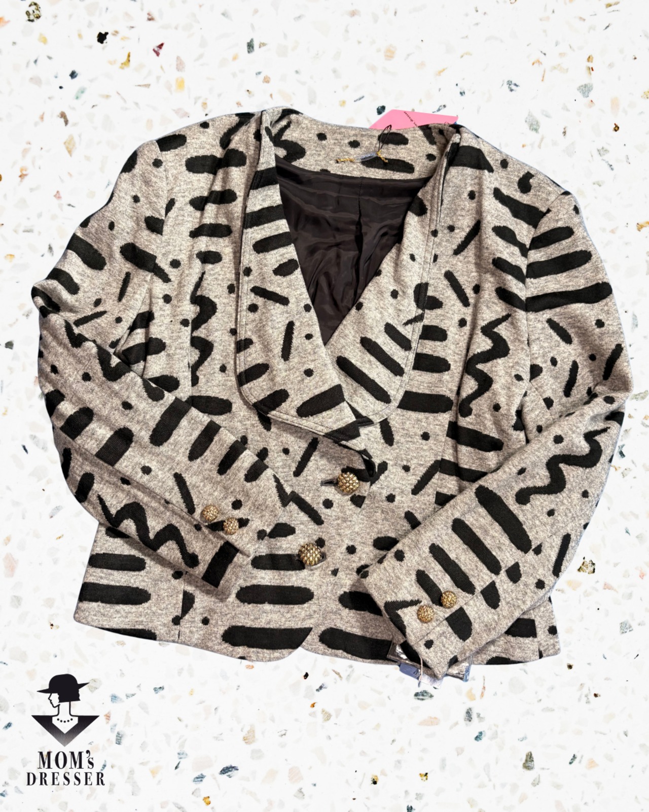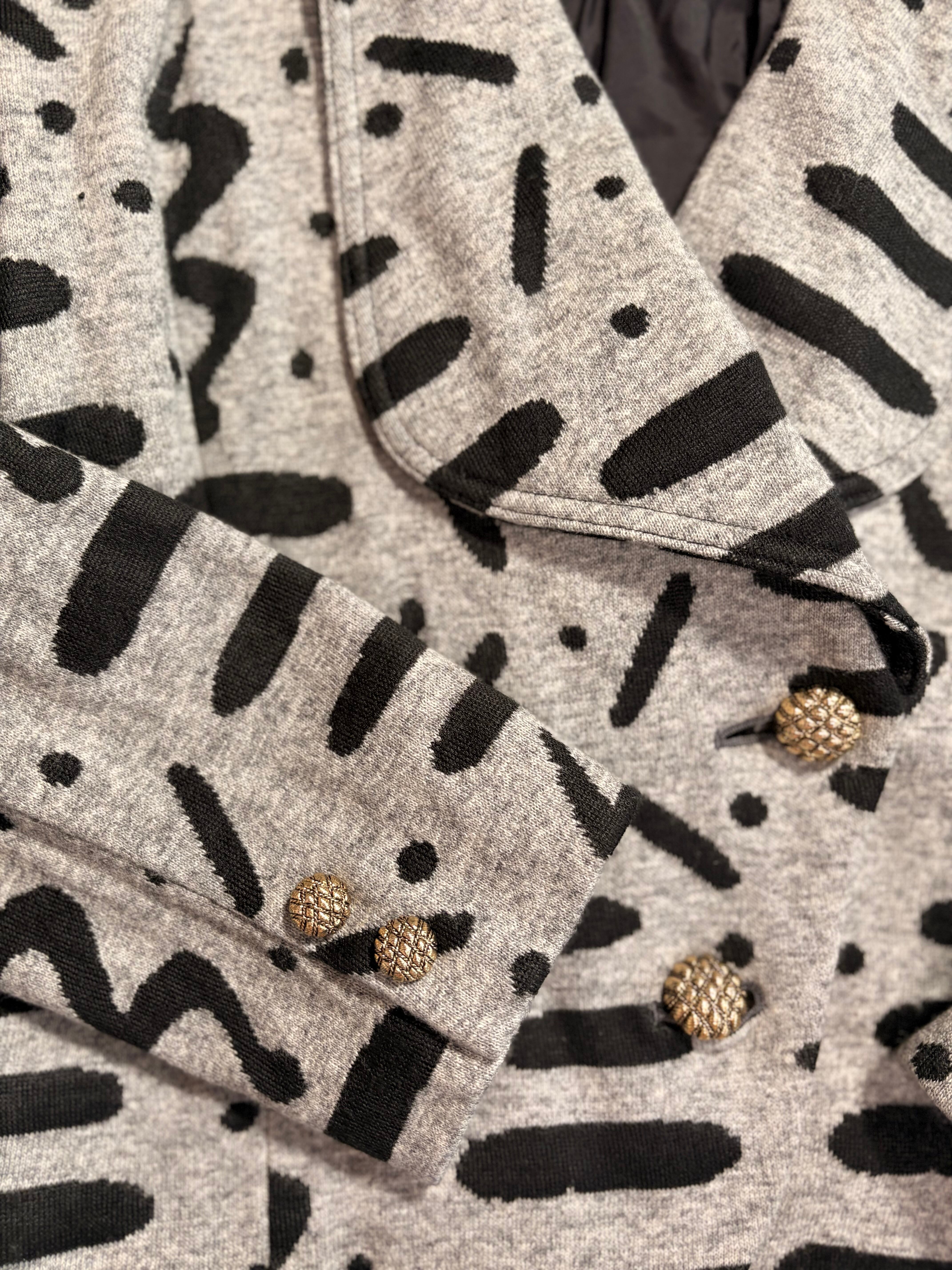 このスウェットジャケットは、個性的な幾何学デザインが魅力です。モノクロの配色が特徴で、どんなスタイルにも合わせやすく、スポーティーなコーディネートにもぴったりです。