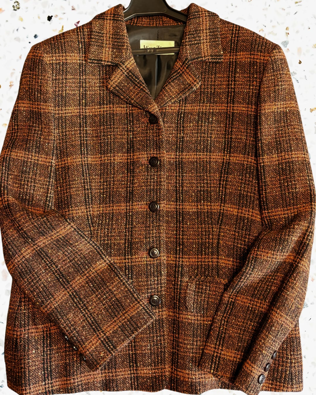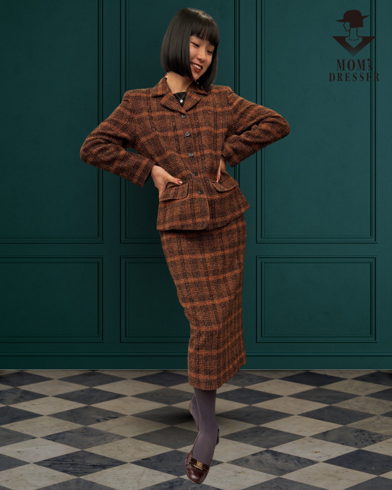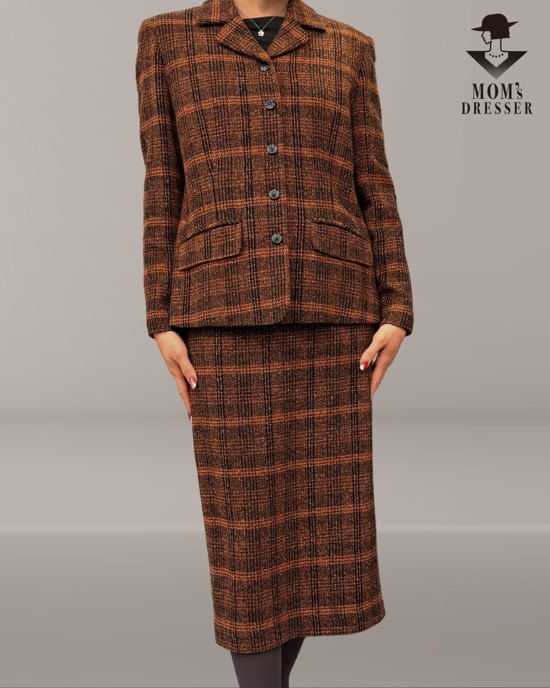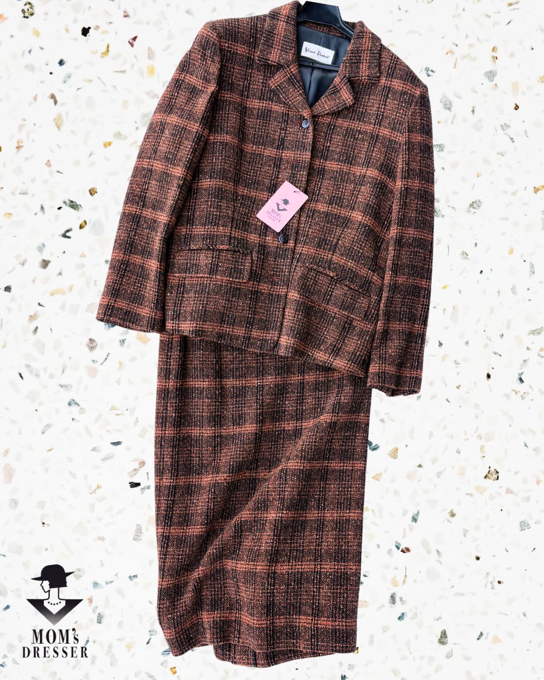 ■ 抑えたトーンのオレンジチェックのセットアップ。柔らかい素材で着心地バツグン。ロングスカート仕様の珍しい一品です。