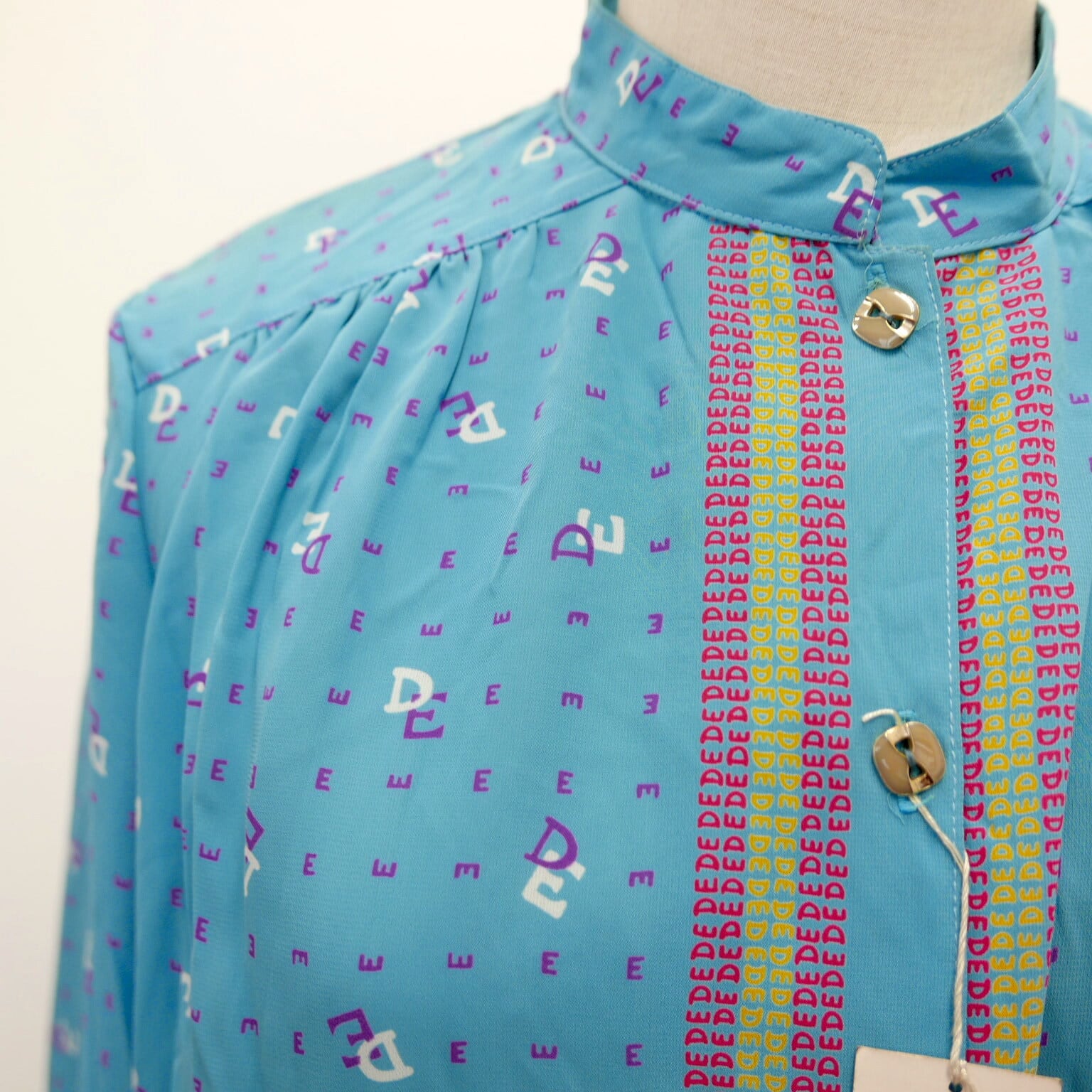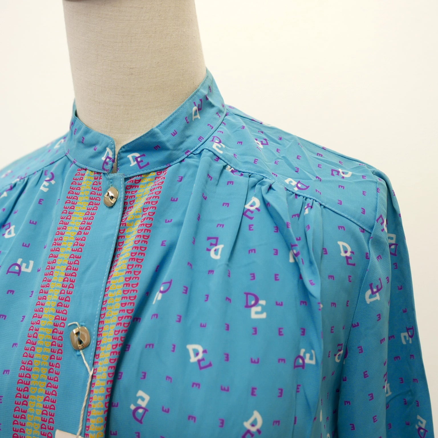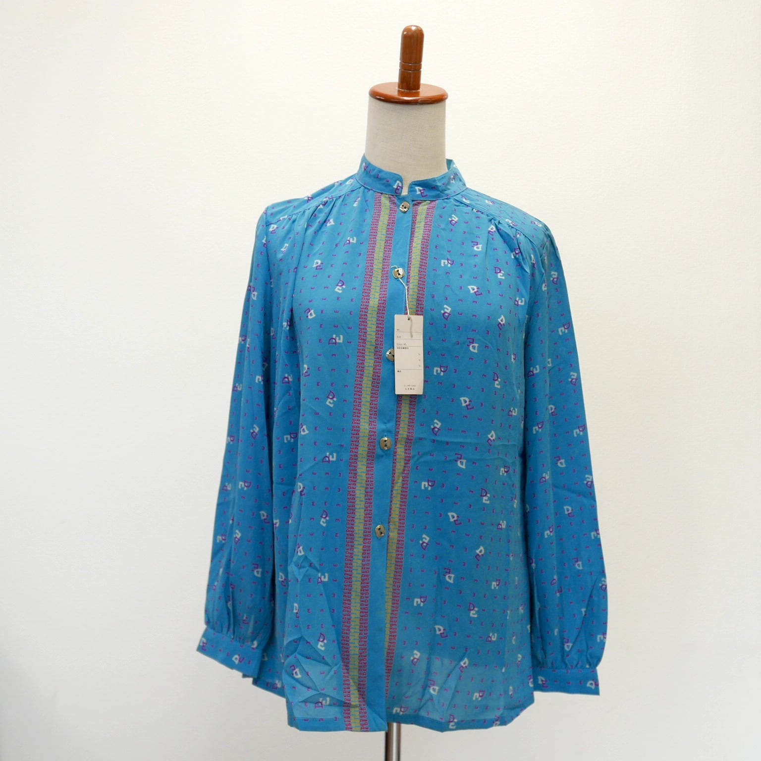 柔らかなシフォン生地に英文字モチーフ柄のブルーの生地、前立て部分は赤と黄色のストライプが印象的なマオカラー長袖シャツブラウスです。