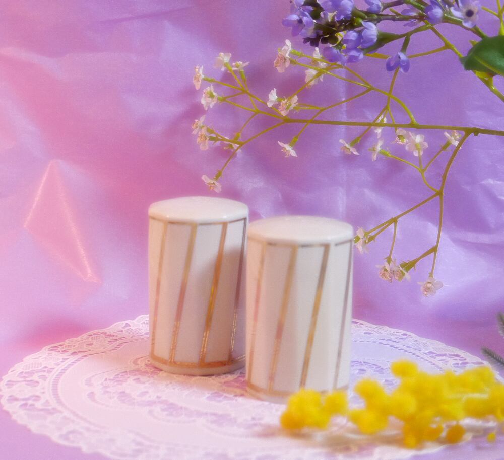 何気ない食卓がぱっと明るくなる調味料セット。白の陶器に金色のラインが規則的にちりばめられて良いアクセントを放つ一品